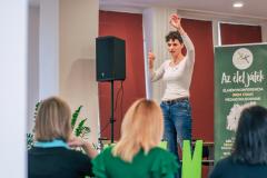 A rövid megnyitó után Molnár Emese, a Jamese zenekar énekese vezette a nagycsoportos bemelegítőt, ahol rövid légzőgyakorlatokkal érkezhettünk meg önmagunkhoz, majd pedig mindenkinek volt lehetősége megérezni és átélni az ének és zene összekapcsoló erejét – zengett három szólamban, improvizációs betétekkel a Komáromi kisleány.